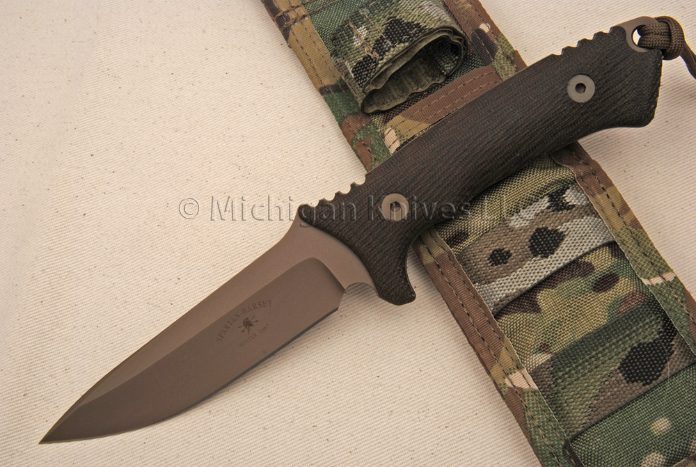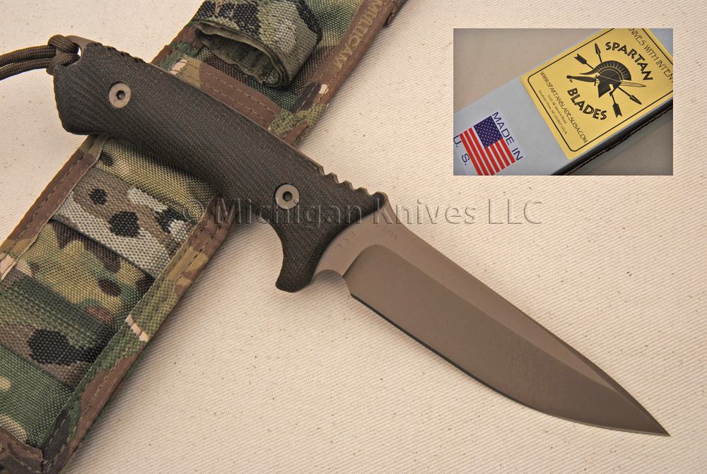 Harsey Hunter Model, 100% everything made in the USA by Spartan Blades. Beveled edge hand-ground by Mr. Bill Harsey. Beautifully constructed combat / field knife made using hi-tech CPM S35-VN Stainless Steel and an ergonomic Green Canvas Micarta handle. Full-open tang construction for added strength. Also includes Camo Nylon belt sheath with Kydex insert. CPM are hi-tech steels made in Ohio by Crucible. FDE (flat-dark earth) Cerakote is a premium finish that enhances wear and corrosion resistance.